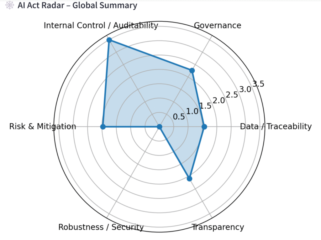 📅 Inventory 🔢 Risk classification 🔢 Gap analysis 📄 Governance mapping 🌐 External dependencies 📆 Roadmap 📊 Monitoring 🔍 Documentation and evidence